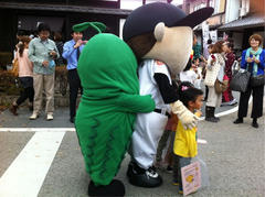 子どもに抱きつくホームラン坊やに抱きつくゴーヤ先生。