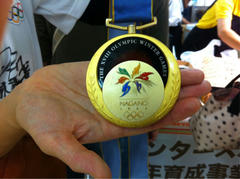 店員さんが、「長野オリンピックの金メダルですよ〜」と手にもって紹介してたので、実際に触らせてもらえました。