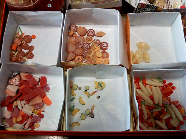 刺身や天ぷら、クッキー、ハンバーグとその付け合わせ、フルーツ各種などなど。
