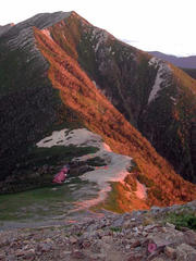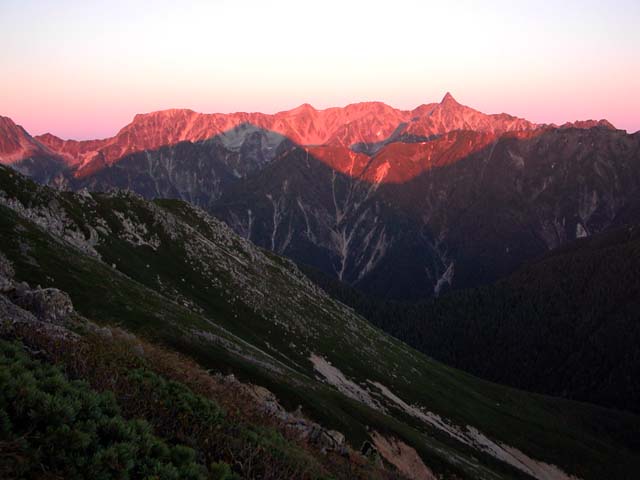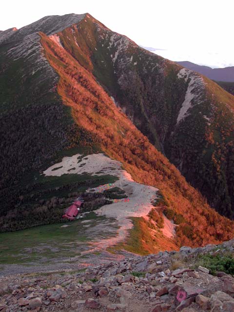 眼下の常念小屋もテント場も、昨日登った横通岳も赤く染まっていきます。